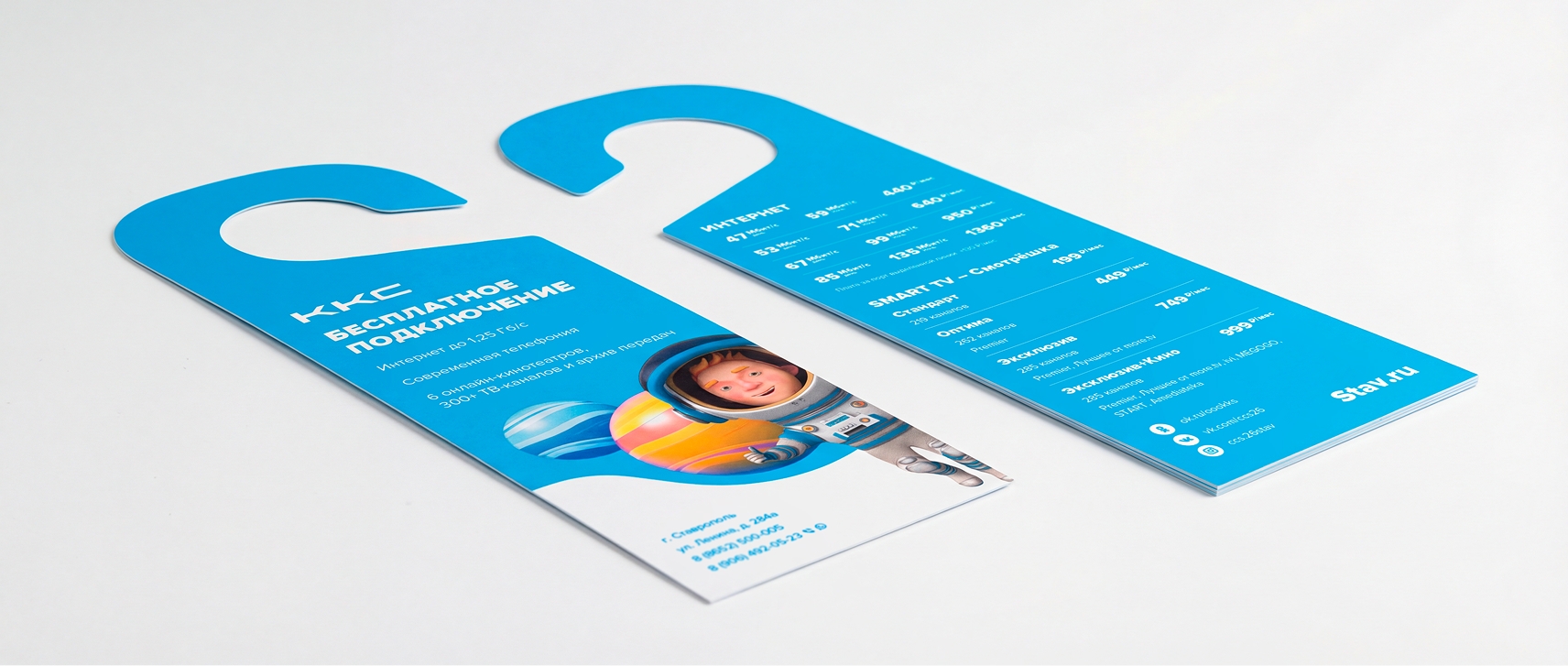 - Структурировано содержание: преимущества на лицевой стороне, тарифы — на обратной, внизу размещены контакты и соцсети.